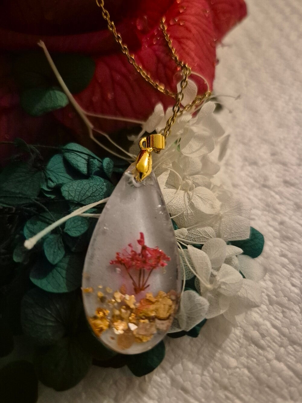 Collier en résine incrusté de fleurs séchées.