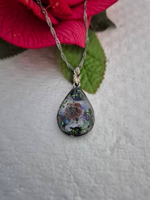 Collier et boucle d'oreille en résine incrusté de fleurs séchées.