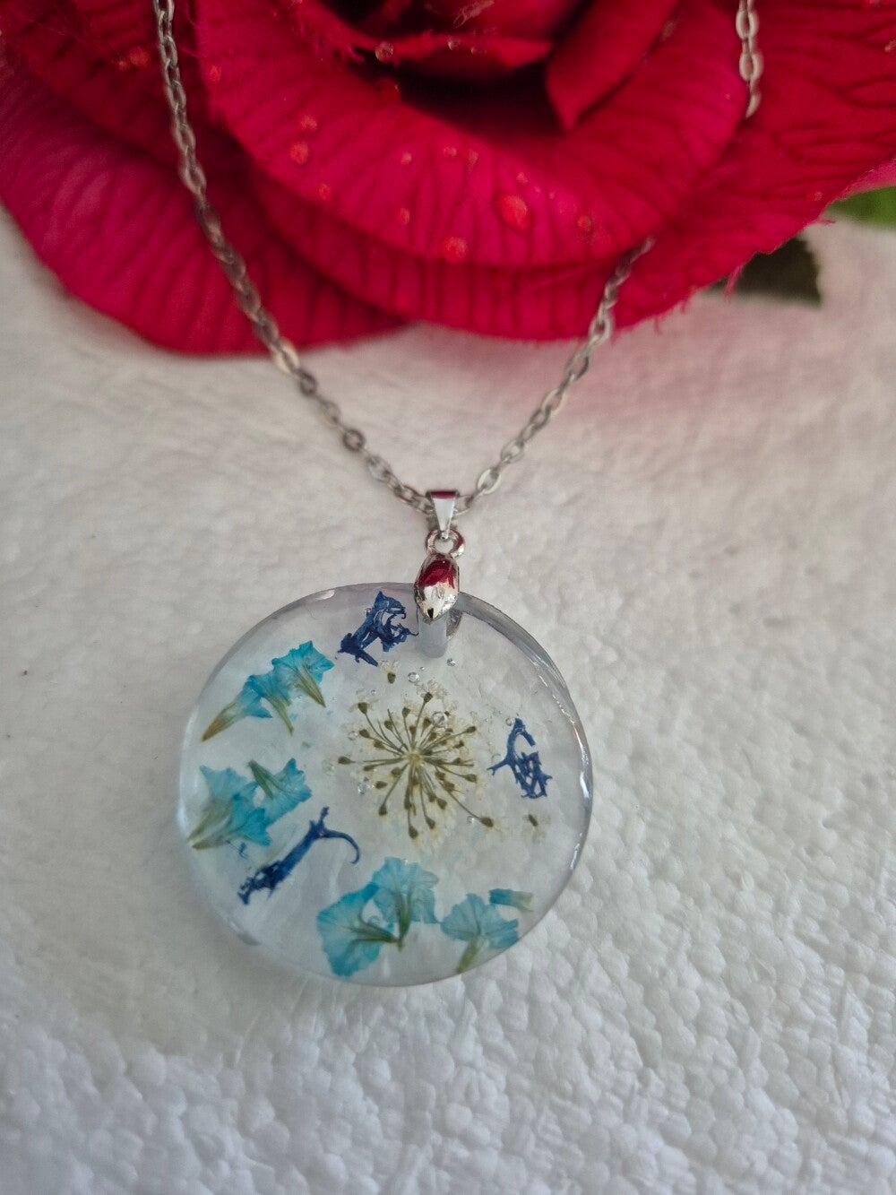 Collier en résine incrusté de fleurs séchées.